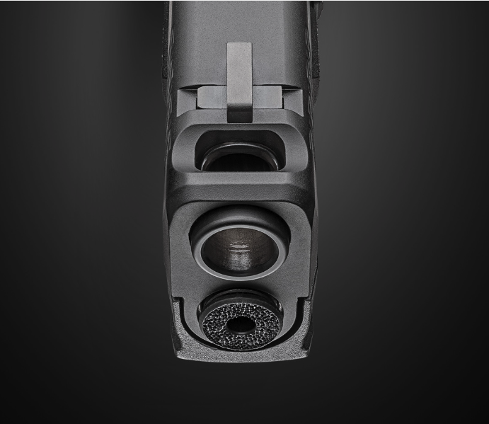 La nueva Hellcat® Pro Comp está equipada con un sistema de compensación integrado en el cañón y la corredera. Este diseño redirige los gases hacia arriba para minimizar la elevación del cañón y mejorar el control, permitiendo disparos más rápidos y precisos.